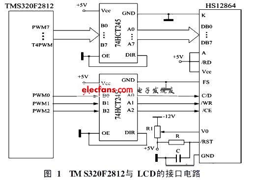 TMS320F2812有两种访问液晶模块的方式:总线方式和I/O口方式。由于液晶模块的处理速度比DSP慢得多,要使两者的速度达到匹配,必须加入一定的延时才能够满足要求,因此在该设计中采用I/O方式,用DSP的数字I/O口来控制液晶显示模块。TMS320F2812芯片的数字I/O口工作电压为3.3V,液晶模块的工作电压为5V,为了保证液晶的正常工作,以及DSP芯片不会因引脚电压过大而被烧坏,两者之间要接电平转换器实现电平转换,由于该系统只对液晶模块写信号,只要实现3.3V到5V电压转换即可,因此本设计用两片74HCT245作为电平转换芯片。