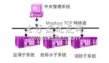 某智能楼宇中各子系统主要采用plc作为主控模块,如图2所示。网络互联采用modbus tcp网络通信模式,中央管理系统与该网络的互联是亟待解决的问题,plc将智能楼宇中各子系统的相关状态和参数信息保存于它的寄存器中,中央管理系统需要读取plc中一些保持寄存器的数值,以此来进行智能楼宇的全面监控与管理。modbus tcp协议提供了相应指令来进行保持寄存器的读取。