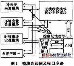 无线传感器网络节点采用模块化的设计方法,每个节点包括无线收发模块、核心主控模块和功能模块。系统通过无线收发模块接收主站发送的命令码,核心主控模块对命令解码,完成对各功能模块的控制(开启采集、时统清零等)。系统要完成多次重复性试验,因此每次试验完毕要把实验数据(冲击波数据、环境变量信息、时统跟定位信息等)存储到数据存储管理模块统一管理,同时准备下次试验。系统工作时,数据储存管理模块SPI接口一方面工作在从模式,接收主控模块发送的命令;另一方面工作在主模式,转发控制其他功能模块的命令码并读取试验数据进行统一管理,图1为在其内扩展专用工作在主模式下的SPI接口的模块问链接图。专用工作在主模式下的SPI接口电路,具有提高模块间数据传输速度与灵活性等特点。