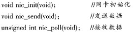 首先编写网卡的驱动程序,以完成网络通信中数掘链路层的任务,它对上层提供3个接口函数: