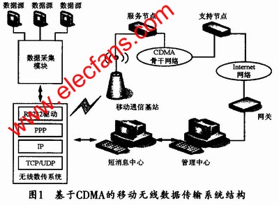 M2M(机器到机器)数据传输方式目前在多个行业中都有着广泛的应用,它可通过数据采集终端对分布于各地的数据进行采集,并将采集到的数据通过通用接口链接到CDMA无线传输模块,再通过它对数据进行透明传输,将相应数据发送到相应的数据中心。图1所示是基于CDMA的移动无线数据传输系统的结构原理图。无线数据传输系统与用户的数据中心之间一般可通过TCP/UDP建立数据连接。用户的数据中心作为通信的服务端,具有公用的固定IP,并指定侦听端口。无线数据传输系统中的数据传输模块可设定为上电自动拨号,如果无线数据传输系统与用户的数据中心之间采用TCP协议传输数据。则自动与服务器建立TCP连接。