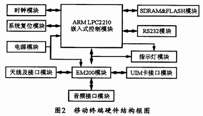 LPC2210是Philips公司的一款16/32位ARM7TDMI-S CPU微控制器。它是基于ARM通用体系结构的RISC微处理器,具有低成本、低功耗、高性能等优点。通常通过RS232/485口接收到用户数据并将数据打成IP包后,可利用EM200模块接入CDMA网络,然后通过各种网关和路由将数据发送到外部网络或者数据处理中心。嵌入式CPU芯片是整个数据采集终端的核心,它不仅要能支持嵌入式操作系统,而且要提供Modem接口用于对CDMA的控制;EM200模块主要完成无线上网功能,它可通过RS232接口与ARM CPU的Modem接口进行连接,以完成对模块的控制(比如拨号和切换模式等)。一旦通过模块连接上Internet,那么,采集到的数据就可以用 TCP/IP传输方式发送到任意一个具有公网IP地址的主机上去,从而实现数据的无线传输。