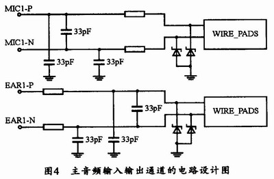 EM200模块提供有完整的音频接口,设计时只需要增加少量外围辅助元器件即可。音频分为主通道和辅助通道两部分。此外,音频设计也应该尽量远离模块的射频部分,以降低射频对于音频的干扰。由于第一路音频输入输出通道(MICI-P、MICI-N;EARl-P、EARl-N)全部为差分信号,所以在具体的PCB布线时,必须满足差分信号走线的要求,并且走线要尽可能的短,以避免射频信号对音频产生干扰。如果仅使用一路音频通道,那么,最好使用第一路主音频通道。其主音频输入输出通道的设计电路如图4所示。