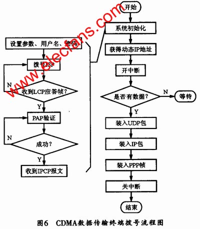 本系统的软件由上位机和下位机软件、服务器应用界面和数据库三部分构成,下位机软件负责ARM微控制器与CDMA模块之间的串口通信,其流程图如图6所示。