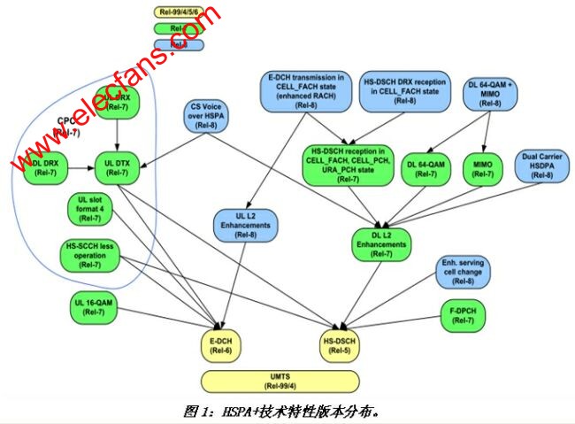 HSPA+在3GPP Rel-7版本开始定义,主要的特性分布在Rel-7和Rel-8两个版本中(图1)。