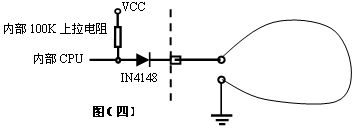 例如断线报警器的连接见图(四),平时报警输入脚被导线连到低电平0不报警,当导线被小偷碰断时,报警输入脚被内部100K上拉电阻拉到高电平1的瞬间形成一个0—1的上升沿跳变,JB35G就发出一次报警短信。报警后输入脚仍然为高电平1,系统不报警。只有报警输入脚又被连到低电平0后再断开才再次报警。有线门磁内部是一个干簧管,它的通断受外部磁铁的影响,连接方法和断线报警完全一样都是上升沿跳变报警。
