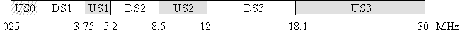 Annex A, 北美地区,频谱分配如图一,其中USx对应上行频带, DSx对应下行频带,US0的起始频点从4 kHz 到25 kHz之间变化, 取决于是否有POTS(传统语音业务),中止频点从138KHz到276 kHz之间变化,取决于是否上行需要更高的速率.