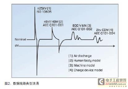 图2显示数据线路上产生的瞬态主要是ESD浪涌。尽管此类浪涌为低能量,但是会产生强大的电磁场。