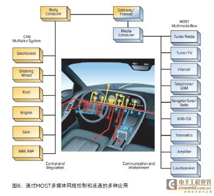 MOST标准支持多种物理接口,如图6所示。MOST标准中,这些应用可参考功能块。每个功能块包括几种功能(如一个CD播放器可以包括播放、停止、弹出和播放时间等功能)。