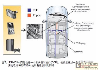 IDB-1394车载结构可分为内置网络和客户便利端口,简称CCP,如图7所示。该标准显示了一种类似于现有MOST标准的一种内置塑料光纤(POF)车载网络。然后,该网络更加稳固且更易使用。多种电子元件可以连接到此网络,如DVD播放器、视屏显示器、导航系统、无线电主机以及通讯设备。