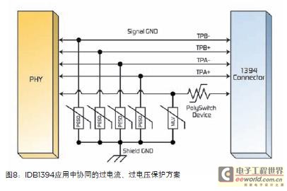 IDB-1394为高速多媒体应用而设计,总线速度高达800Mbps且要求通电端口具有可复位过电流保护。如图8所示,PolySwitch设备可用于在出现故障时限制危险高电流。MLV可安装到供电总线上避免ESD浪涌和过电压瞬态所产生的损害。低电容PESD设备或PESD阵列也可安装在数据线路上帮助提供ESD保护。
