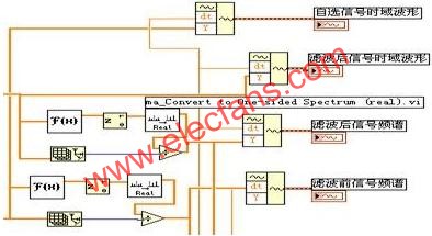 在程序的前面板,用一个下拉框表来实现选择不同滤波器模式的功能,总共设置了九种不同的模式,当我们要观察自选信号不经过滤波的形状时我们可以选择关闭滤波器,当我们观察在不同滤波器下的滤波效果时可以切换到不同的模式观察,滤波部分的程序图表如图3所示。