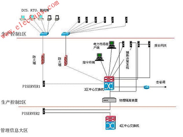 将底层控制系统与上层管理信息系统联系起来是过程企业信息集成的必然要求,作为两者之间的桥梁,PI实时数据库广泛应用于电力,化工等行业,它在第一时间将生产系统的数据传递到业务系统,使检修人员可以即使发现问题迅速响应,管理人员也可以根据历史趋势全面掌握设备的运行情况。我公司是具有两台机组的火力发电厂, PI系统的实施为信息管理系统提供了大量有价值的数据,缩短了上到公司领导下到检修人员与生产现场的距离,节省了人力,提高了效率。生产控制1区的DCS、RTU、脱硫接口通过边界防火墙实现和生产控制二区的逻辑隔离;生产控制大区与管理信息大区部署电力专用隔离装置,实现物理隔离,两大区之间只有单向的数据交流,即PI系统中的实时数据由生产控制大区到管理信息大区的数据传输。管理信息大区的PI服务器通过千兆光纤连到中心6509交换机,再通过百兆网线到桌面客户端。