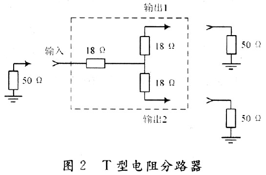 根据信号流程,压控振荡器POS-100的输出分为两路:一路反馈于ADF4111,另一路作为本振输出。此时,压控振荡器的输出需要经过一个T型网络分成两路,这里T型网络是一个电阻分路器,如图2所示。它广泛应用于一个源需要驱动两个负载的情况,其目的是进行电路的阻抗匹配。常用三个18 Ω的电阻值连成Y型。如果其中的一个负载为50 Ω,它就相当于衰减6.3 dB的T型网络。