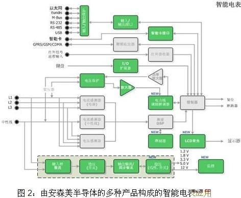 安森美半导体应用于智能电表的方案包含一系列标准产品、专用标准产品(ASSP)及专用集成电路(ASIC),可以提供智能电表的4种基本功能,包括:电源/电源管理、计量、寄存及通信。图2是由安森美半导体的多种器件(图中绿色部分)构成的智能电表应用。