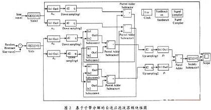 图3中的基于子带分解的自适应滤波器模块框图系统由分析滤波器子系统h00,h01,h10,h11,综合滤波器子系统g00,g01、抽取,插值,加法,减法器,自适应滤波器等模块组成。h00和h10是完全一模一样的低通滤波器,h01和h11是完全一模一样的高通滤波器。h00,h01,g00,g01的幅频特性曲线见图2。h00对应图2中的h0,h01对应图中的h1,g00对应图中的g0,g01对应图中的g1。Subysteml,Subyst-em2,Subystem3,Subystem4是自适应滤波器。Subystem2,Subystem3自适应滤波器的阶数是Subysteml,Subystem4阶数的1/20。期望信号由sine wavel模块提供,输入信号由Sine wave2和Random Bitstream叠加在一起的信号组成。系统所需的模块都是直接调用DSP builder中的模块。Subystem2是7阶NLMS算法自适应滤波器,其框图见图4。如果调高提高收敛速度,则可增加延迟模块、自适应子系统模块,加法器模块即可,但需消耗更多的硬件资源。