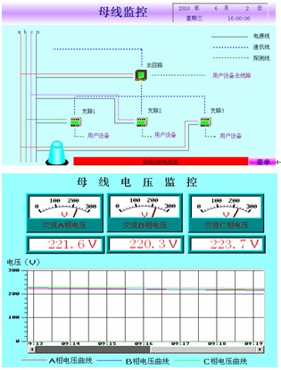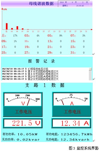 主要检测数据对象有母线电流、电压、功率、电能、母线谐波数据,各个支路电压、电流、功率、电能,及各个支路的分合状态。显示以数字显示、折线图、条形图为主,见图3。