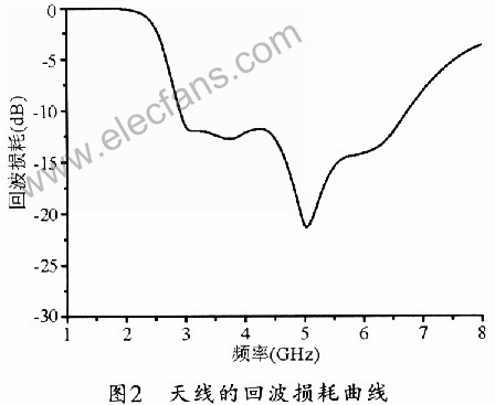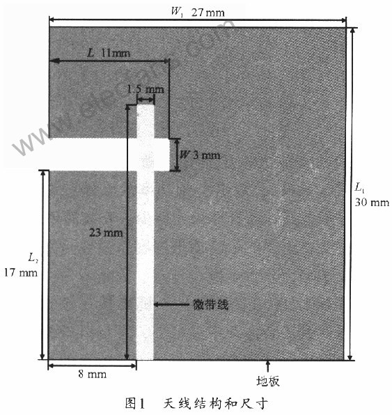 图l给出了该天线的具体结构尺寸。该天线被制作在厚度为0.8 mm、介电常数为4.4的FR4介质板上,介质板的尺寸为27 mm×30 mm。设计时可将开口缝隙开在地板上,该缝隙的位置应使得整个地板呈非对称性。微带馈线则位于介质板的另一面。这样,通过50 Ω阻抗匹配的微带馈线与背面的开口缝隙之间的耦合,即可实现整个小天线的宽带特性。
