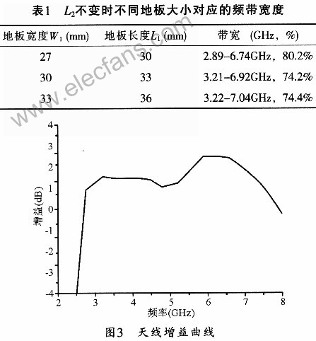 图2所示是该天线仿真所得的回波损耗曲线。该天线的工作频段为2.89~6.74 GHz,阻抗带宽约为80.2%,回波损耗小于-10 dB。表1所列是该天线在L2不变时不同大小的地板所对应的工作频段。图3是该天线的增益曲线,可见,整个工作频段内的天线增益变化小于3 dB。同时,该天线的辐射方向对于无线传输设备也是可以接受的。