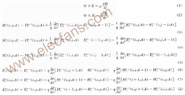 为了便于计算编程,空间和时间的编号为整数值,可得到无源区麦克斯韦旋度方程式(1)和式(2)的各分量的迭代公式见式(3)~式(8):