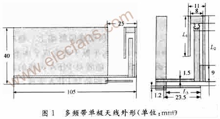 基本多频带单极天线结构如图1所示,PCB主板采用通用FR4材料,板厚1 mm,尺寸为40 mm×105 mm。天线的主辐射单元通过开槽形成两个辐射分枝,这两个辐射分枝长度不同,通过调整辐射分枝的长度,可得天线获得两个谐振频率,分别对应900 MHz和1800 MHz。靠近馈线的接地辐射片用于调节高端的谐振频率,使得高频带的工作范围能满足TD-SCDMA要求,天线辐射单元的最终尺寸通过仿真软件的优化而确定。