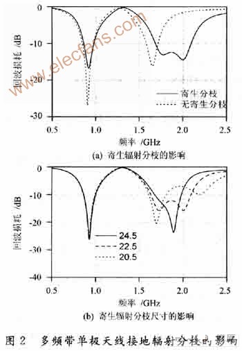 图 2显示了接地寄生辐射分枝对天线工作频带的影响。从图2(a)可以看出,没有接地辐射分枝的情况下,天线仅能覆盖GSM900和DCSl800,通过添加接地辐射分枝,有效地扩展了天线的工作频带。图2(b)显示了接地辐射分枝的长度L3对天线高频带的影响。通过调整其长度,使得与主辐射片的短辐射分枝的谐振频率部分交叠,可以获得最大的工作频带。