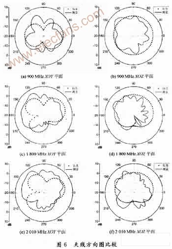 图 6比较了天线仿真方向图和试验天线的测试方向图。由仿真天线方向图可知,天线方向图与典型的单极天线方向图非常接近,垂直平面内的辐射方向图具有比较好的全向性能,同时工作频率的提高,使水平方向图中波瓣增加,但垂直平面内仍保持较好的全向特性。比较仿真的方向图和实际测试的方向图,由于测试数据的波动,导致两者形状差别很大,但实测方向图与仿真数据相比在幅度上基本一致。