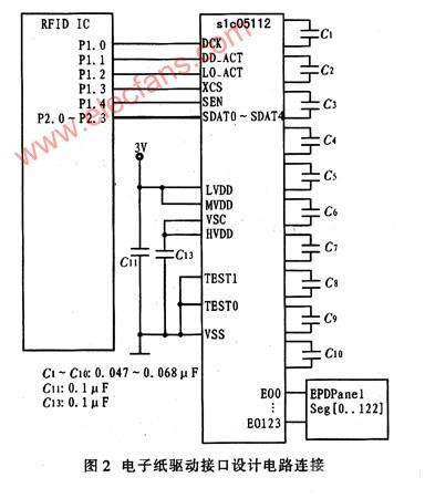 电子纸需要专门的驱动器才能驱动显示,这里电子纸驱动器件采用EPSON公司生产的slc05112.slc05112内置接口电路和驱动电子纸模块,3V供电,便于与MCU通信。电子纸驱动模块分别与MCU的I/O端口相连接.通过I/O端口模仿电子纸驱动模块时序图。主控制器可以通过软件实现电子纸驱动模块的初始化启动、刷新显示和关断。图2为电子纸驱动接口设计电路连接。