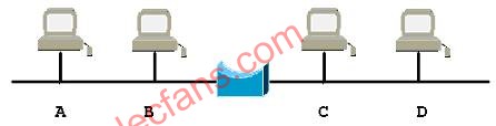 理解以太网交换机的作用还要从网桥的原理讲起。传统以太网是共享型的,如果网段上有四台计算机A、B 、C和D,那么A与B通信的同时,C和D只能是被动的收听。假如将缆段分开(即微化),A、B在一段上,C、D在另一段上,那么A和B通信的同时,C和D也可以通信,这样原有10M的带宽从理论上讲就变成20M了。同时,为了确保这两个网段可以互相通信,需要用桥将它们连接起来,桥是有两块网卡的计算机,如下图所示: