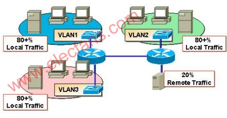 通常,路由器的性能比交换机要差一些,因为路由器是基于软件的查表转发,而交换机可以实现硬件的直通式转发。但在传统的园区网络中,路由器并不会成为网络的瓶颈。因为80%的数据量是在网络内部的通讯,只有20%的数据是做远程访问,也就是说,大多数经过交换机的信息并不经过路由器。这就是传统网络的80/20流量模型。