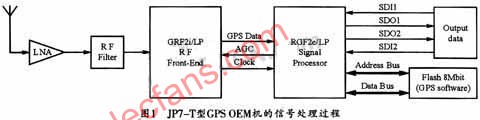 本设计根据实际项目需要将所调研的几种GPS资料进行了比较权衡,最后选择了德国FALCOM公司生产的JP7-T(SIRF2)GPS模块。该模块有12个信道GPS接收模块、完整的温度补偿晶体振荡器、SiRF2型芯片一低功率芯片集、高级TIFF频率、3种不同供电模式、更小的体积、PIN脚与JP7-LP兼容并有记忆功能,同时内嵌Falcom记忆查询软件。利用此模块作为核心部分,笔者还设计了一块demo板进行测试。FAL-COM公司生产的JP7-T(SIRF2)GPS模块的内部信号流的处理过程如图1所示。