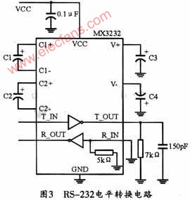 通过分析GPS模块的内部电路和引脚可知,其4、5引脚为第一组I/O口,分别是SDI1和SDO1,其中SDI1是主要的接收信道。用来接收GPS板的软件命令,SDO1是主要的传输信道,用来将导航数据传输到用户程序;6,7号引脚为第二组I/O口,分别是SDI2和SDO2;17号引脚是RF_IN,用于为GPS提供从天线接收到的信号;19号引脚用于为天线提供电源。其中SDI和SDO都是TTL电平,故在将其通过RS-232串口与PC机相连以进行测试前,必须将TTL标准信号转换成232标准信号才能与PC机进行通信,本设计采用MAX3232电平转换芯片,其转换电路如图3所示。鉴于GPS模块的频率和项目产品的设计需要,本设计选择了5米GPS车用磁性吸盘天线,其中心频率也是L1,它接收卫星定位信息的定位精度小于15米。