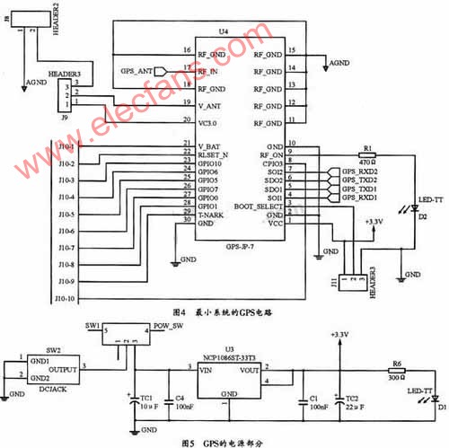 图4所示是基于JP7-T的最小启动电路而设计的GPS接收机电路。图5给出了该电路的电源部分电路图。