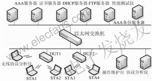 其中DUT1和DUT2 为待测产品的样品,AAA服务器和证书服务器主要用于测试产品的认证和计费等功能;无线协议分析仪和协议分析仪可捕获待测产品与终端及服务器之间的信号传输过程,进行协议一致性分析;操作维护台为待测产品的参数配置平台;性能测试仪主要用于待测产品的吞吐量、时延以及稳定性等性能测试。