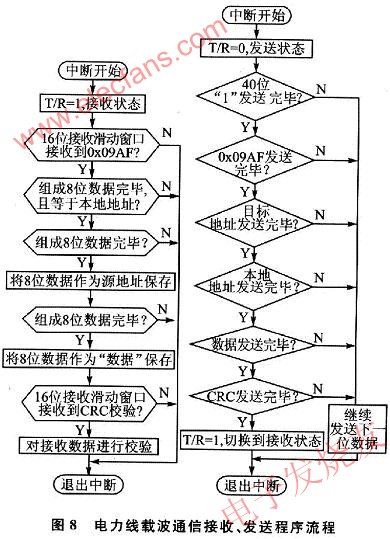 载波通信程序采用中断方式,分发送和接收两部分,中断信号由PL2102同步脉冲输出引脚(HEAD)产生,载波通信接收、发送程序如图8所示。