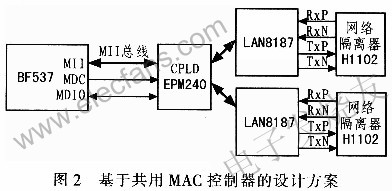 因此提出一套MAC控制器,2个以太网接口芯片的设计方案。该设计方案通过1片CPLD将BF537的MII总线分别转接到2片IAN8187上,并由BF537来控制转接的时机。这样形成了2个以太网通信通道,大大简化了设计,提高了冗余切换的实时性。该设计方案如图2所示。