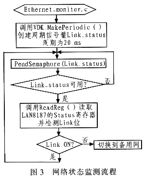 对Basic Status Register的监测采用轮询的机制,即设定一个信号量Link_status,其周期为2 ms,因此每隔2 msEther moniter线程被触发一次。在Ether_moniter中通过调用RdPHYReg()函数,读取Basic Status Register的值,并判断Link位。Ether_moniter线程流程如图3所示。