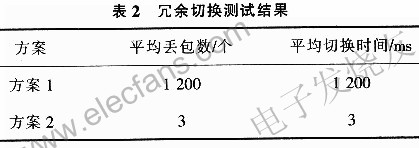 用Visual C++6.0开发的简单的上位机测试程序,每隔1ms发送一个UDP数据报,并给每个数据报编写不同的序号。在BF537中编写程序不断接收上位机发来的数据报,然后制造网络通信故障,本文构建的冗余网络将会自动切换到备用通道继续接收上位机的数据报,最后通过检测接收到数据报的序号来确定冗余切换所消耗的时间。分别对两种方案所构建的冗余网络的切换进行测试,结果如表2所示。