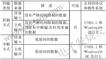中断输出传输是USB1.1规范才有的内容,且必须获得Windows系统的支持。从Windows98 SE版本开始才支持中断输出传输方式,所以如果需要中断输出传输方式的设备应该选择相应的操作系统。表1列出了传输类型和相关情况。