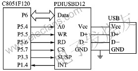 该设备采用C8051F120微控制器和PDIUSBD12芯片来实现,如图3所示。