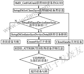 Windows为应用程序访问HID设备提供了强大的支持,有一整套对HID设备进行访问的API。应用程序要访问设备就必须先枚举到设备,图4为应用程序枚举HID设备流程。