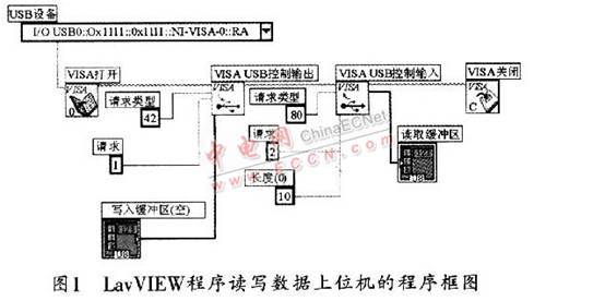 采用NI公司的LabvIEW实现上位机程序开发,开发时可采用控制传输方式。控制传输中使用函数“VISA打开”来打开指定的USB设备,而“VISA USB控制输出”函数则用来完成定义请求0xBl,它可将“写入缓冲区”中的数据写入