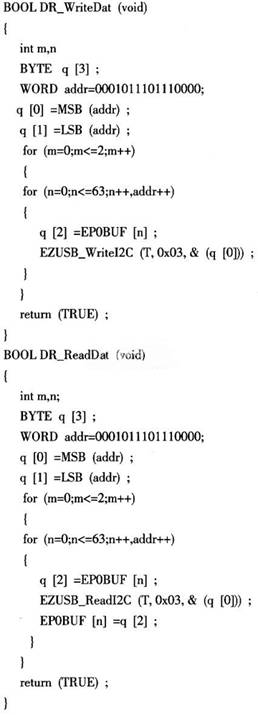 adI2C(BYTE addr,BYTE length,BYTE xdata*dat),其中的addr指定I2C设备地址;length为传送数据长度;*dat为接收数据缓冲区起始地址;该函数用于从EZ-USB I2C接口读一串数据。在所有被请求的数据读入缓冲区之前,该函数立即返回。用户需要不断的询问I2C的状态,以确定数据何时有效。如果当前正在发送或接收数据,则调用该函数时返回FALSE,数据也不被读出,当I2C端口不忙时,则读取数据队列并返回TRUE。