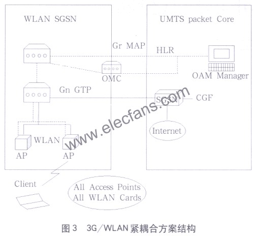 按照与移动通信融合的紧密程度,这类解决方案可以分为松耦合和紧耦合两大类。下面介绍一下紧耦合解决方案。如图3所示。