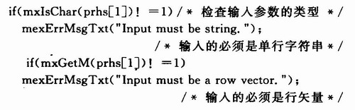 (1)void mexFunction(int nlhs,mxArray*plhs[],int nrhs,const mxArray*prhs[])。函数头中nlhs是Matlab命令行方式下输出参数的个数;*plhs[]是一个mxArray结构体类型指向所有输出参数的指针数组;*prhs[]也是是一个mxArray结构体类型指向所有输入参数的指针数组;nrhs是输入参数的个数。
