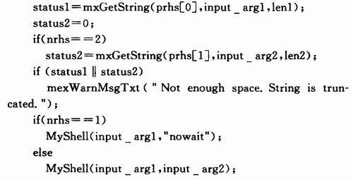 C语言的MEX文件源程序主要由两个部分组成:第一部分是算法程序,用于完成实际工作;另一部分是入口子程序,它是算法程序与Matl-ab的接口。入口子程序实现接口功能是通过在输入指针数组中获得算法程序所需的数据,同时也能把计算结果返回到输出指针数组。在这里mexFunction有着输入/输出与变量转换的作用。参照本文编写的mexrun.cpp文件,需要注意以下几点:
