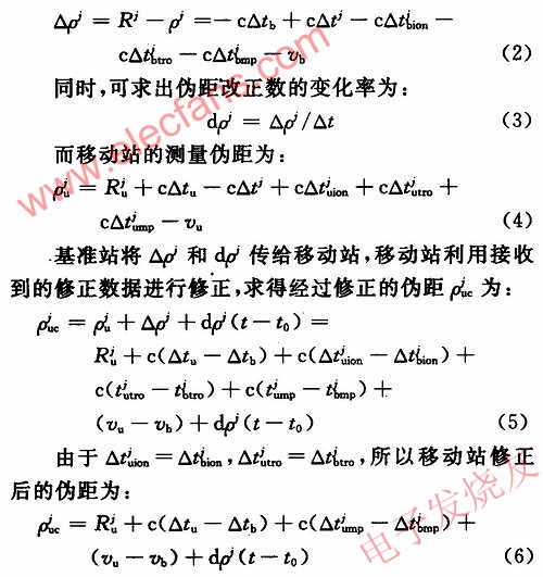 伪距差分GPS具有精度高等诸多优点,是目前用途最广的一种差分GPS技术,RTCM SC-104标准和几乎所有GPS接收机的差分定位均采用这种技术。在伪距差分GPS系统中,基准GPS接收机可精确地求出基准站的地心坐标,并收集全部卫星的星历文件,计算出每一时刻所有可见,星的地心坐标,从而得到各个卫星到基准站的真实距离Rj,同时基准GPS接收机测量出全部可见卫星的伪距