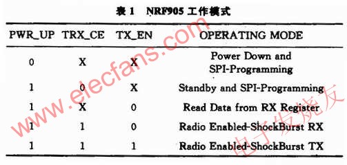 NRF905有ShockBurst接收与ShockBurst发送两种工作模式;掉电和SPI编程与Standby和SPI编程两种节电模式。其ShoekBurst工作模式的特点是自动产生前导码和CRC,可以通过SPI接口进行编程配置。NRF905的工作模式由对TRX_CE,TX_EN,PWR_UP的设置来设置,见表1。