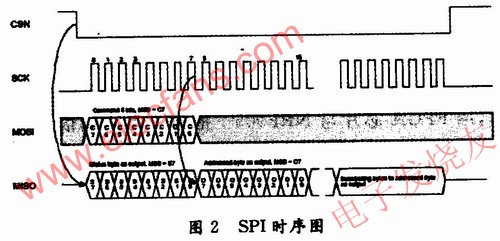 图2为NRF905的SPI接口的时序图,由此本文设计的SPI工作模式是在CPOL=O,CPHA=O这种时序下。