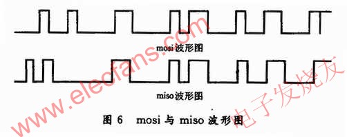 系统建立起来后,下一步是最终的板级验证。图6为用Chipscope得到的波形图。mosi与miso分别是发送端与接收端SPI总线上的信号。从图中可以看出数据基本吻合,由此表明设计的以FPGA控制NRF905的无线通信系统能够正常工作。